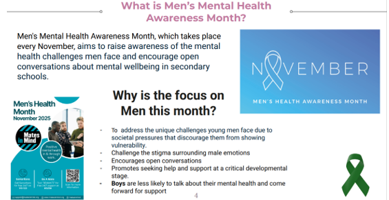 The Changemakers created an important tutor session that was delivered to the whole school focused on Men’s Mental Health Month. This session discussed critical topics such as The Mask, stigma surrounding boys’ mental health, and signposted sources of support.