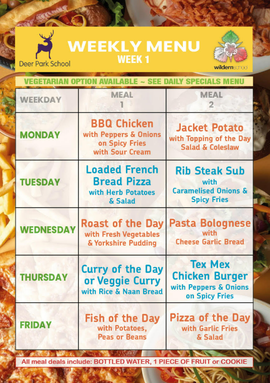 The main school meal deals are £3.40 which is in line with all Hampshire schools. In a meal deal, students can get one of the meal choices below with a bottle of plain water and a cookie or piece of fruit.