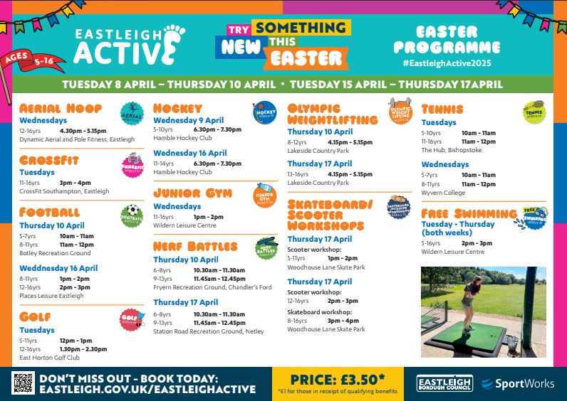 The Eastleigh Active programme of sports and activity sessions expands to Easter for a third year to help children and young people across the Borough to escape the everyday this April. Eastleigh Borough Council’s programme will run Tuesdays to Thursdays, 8 - 10 and 15 - 17 April across the two Easter holiday weeks for 5-16-year-olds. It sees the return of popular activities such as Golf, Tennis and CrossFit.