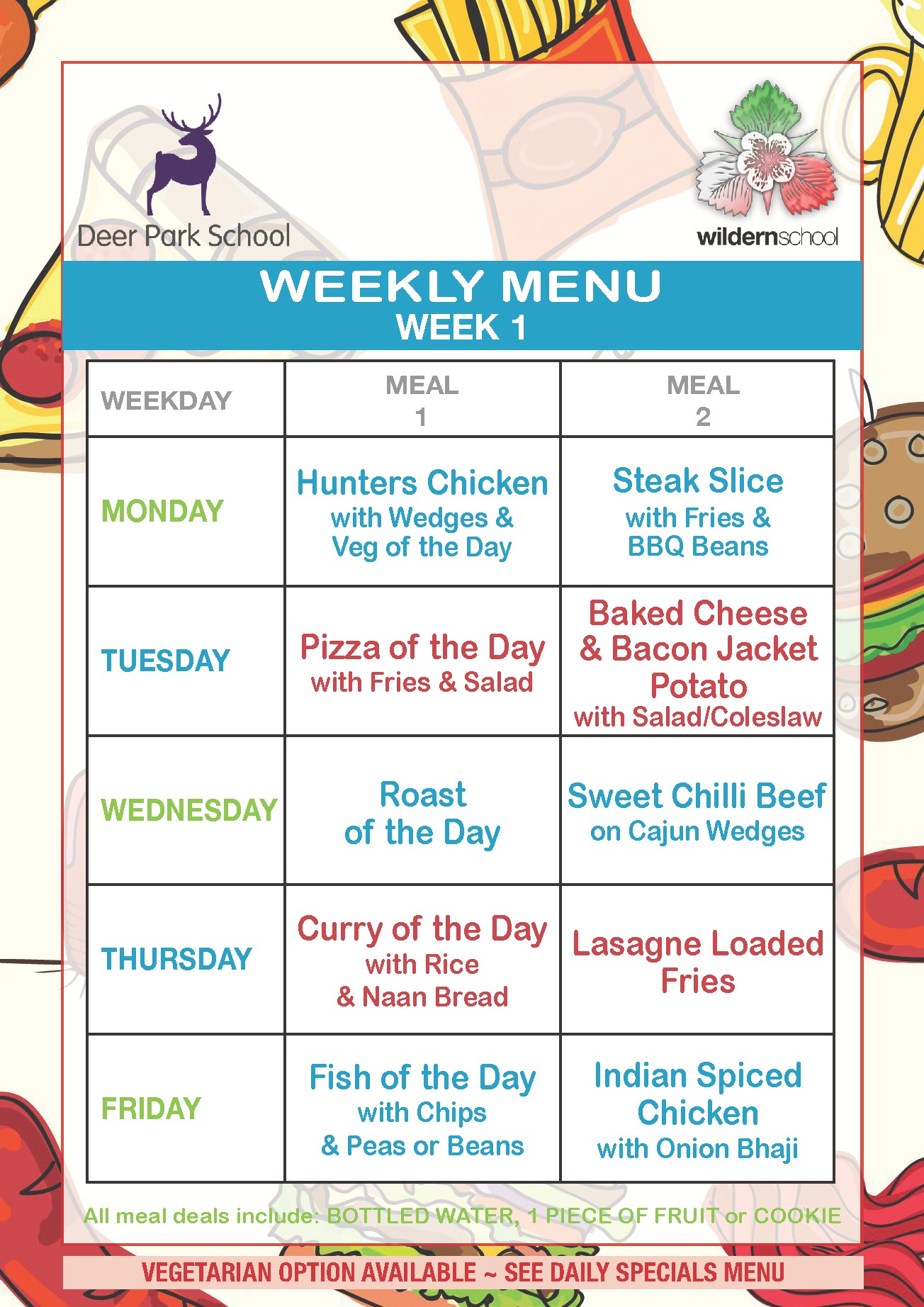 The main school meal deals are £3.20 which is in line with all Hampshire schools. In a meal deal, students can get one of the meal choices below with a bottle of plain water and a cookie or piece of fruit.