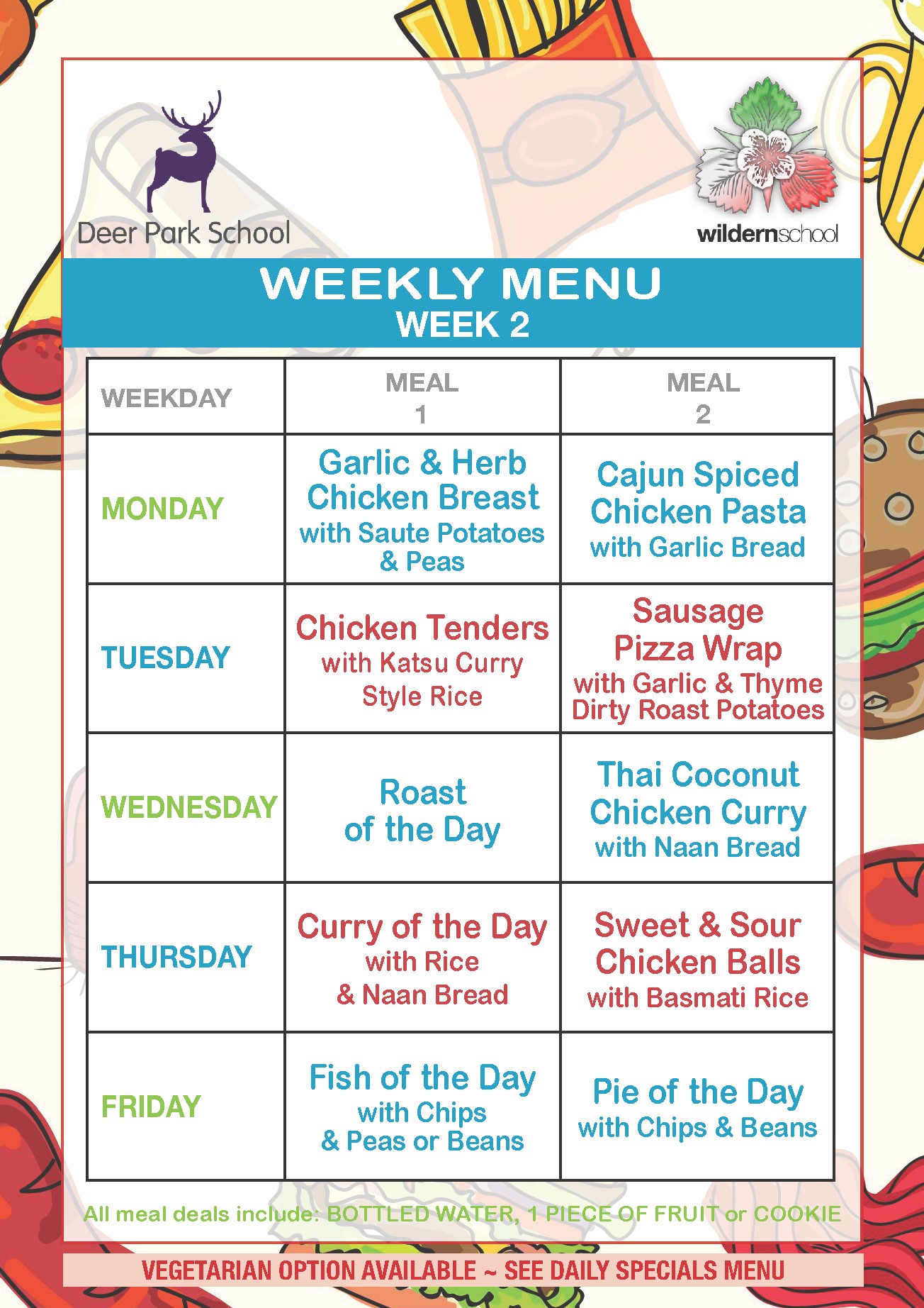 Please remember, we can adapt the majority of meals to any dietary needs if we know in advance (your child can speak to kitchen staff by visiting the kitchen before 8:30am that day). Main A/B vegetarian options are always available - just ask Dan and his team.