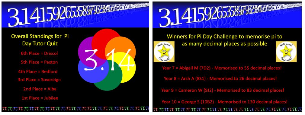 - Tutor group quiz, where students tested their knowledge on the origins and uses of pi, as well as solving some tricky dingbats. Many tutor groups took part, earning valuable house points, with Jubilee winning this competition overall.