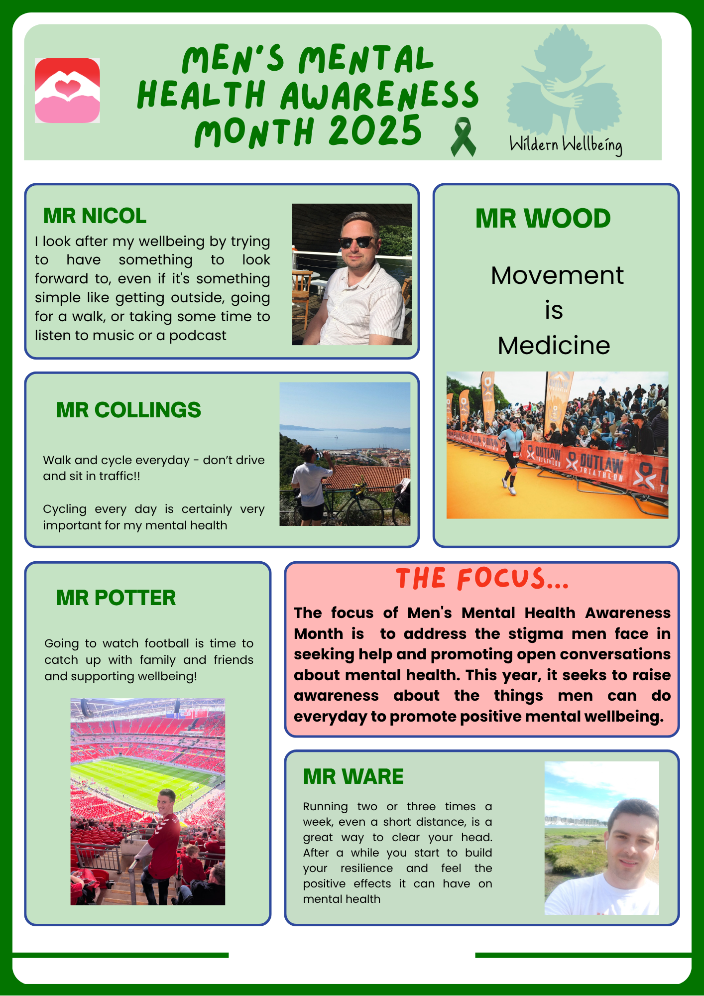 This raises awareness for men's mental and physical wellbeing, challenges stereotypes, and promotes positive male role models. It's a time to encourage open conversations, normalise seeking support, and combat issues like isolation and high suicide rates among men. At Wildern we are building a culture to promote positive wellbeing for all!