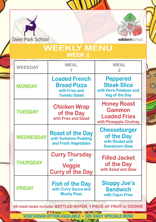 The main school meal deals are £3.20 which is in line with all Hampshire schools. In a meal deal, students can get one of the meal choices below with a bottle of plain water and a cookie or piece of fruit.