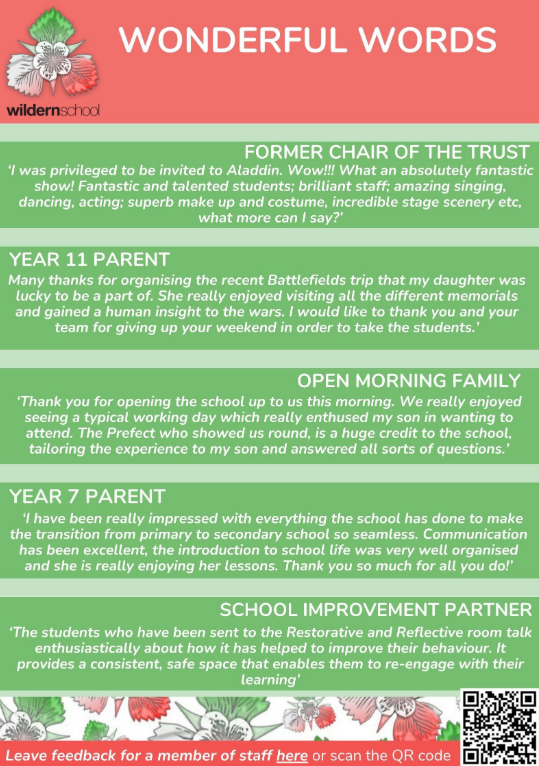 - The Wildern Kindness Challenge: We are making kindness visible! Staff will be actively looking for and rewarding all acts of Kindness they witness or hear about using special e-refs. Students who collect the most will be celebrated, demonstrating the power of positive actions. Those celebrated students will also be entered into a prize draw!