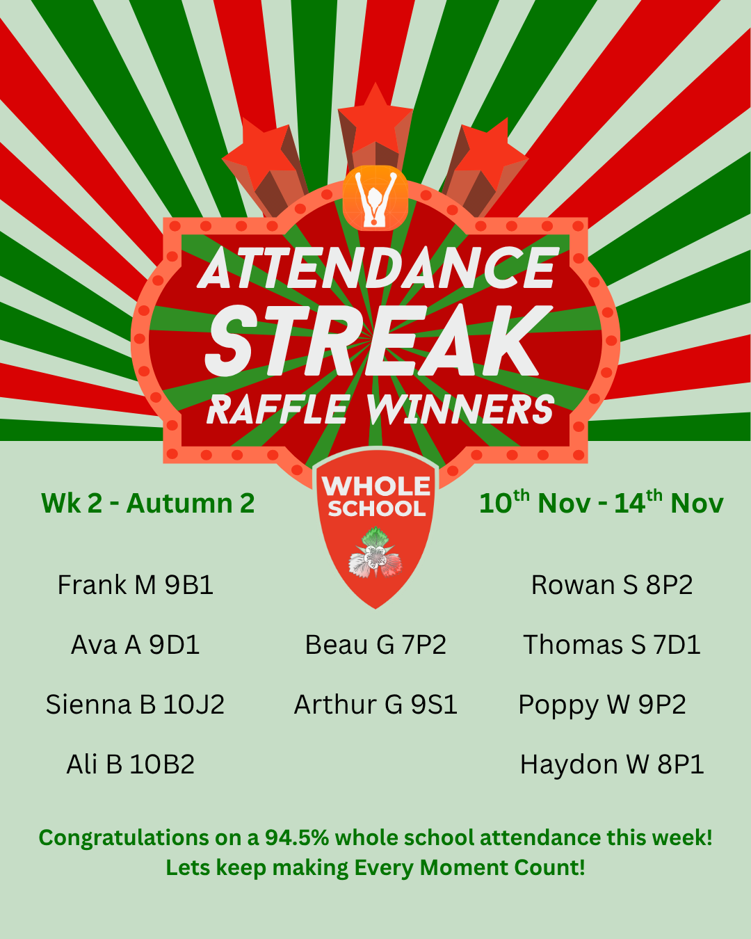 We have relaunched our 100% Attendance Raffle this term. Every Monday during tutor time, we celebrate students who achieved 100% attendance the previous week. All qualifying students are automatically entered, and 10 lucky winners receive a Skip the Queue Pass for the canteen, which they can use once during the following week - with a friend!