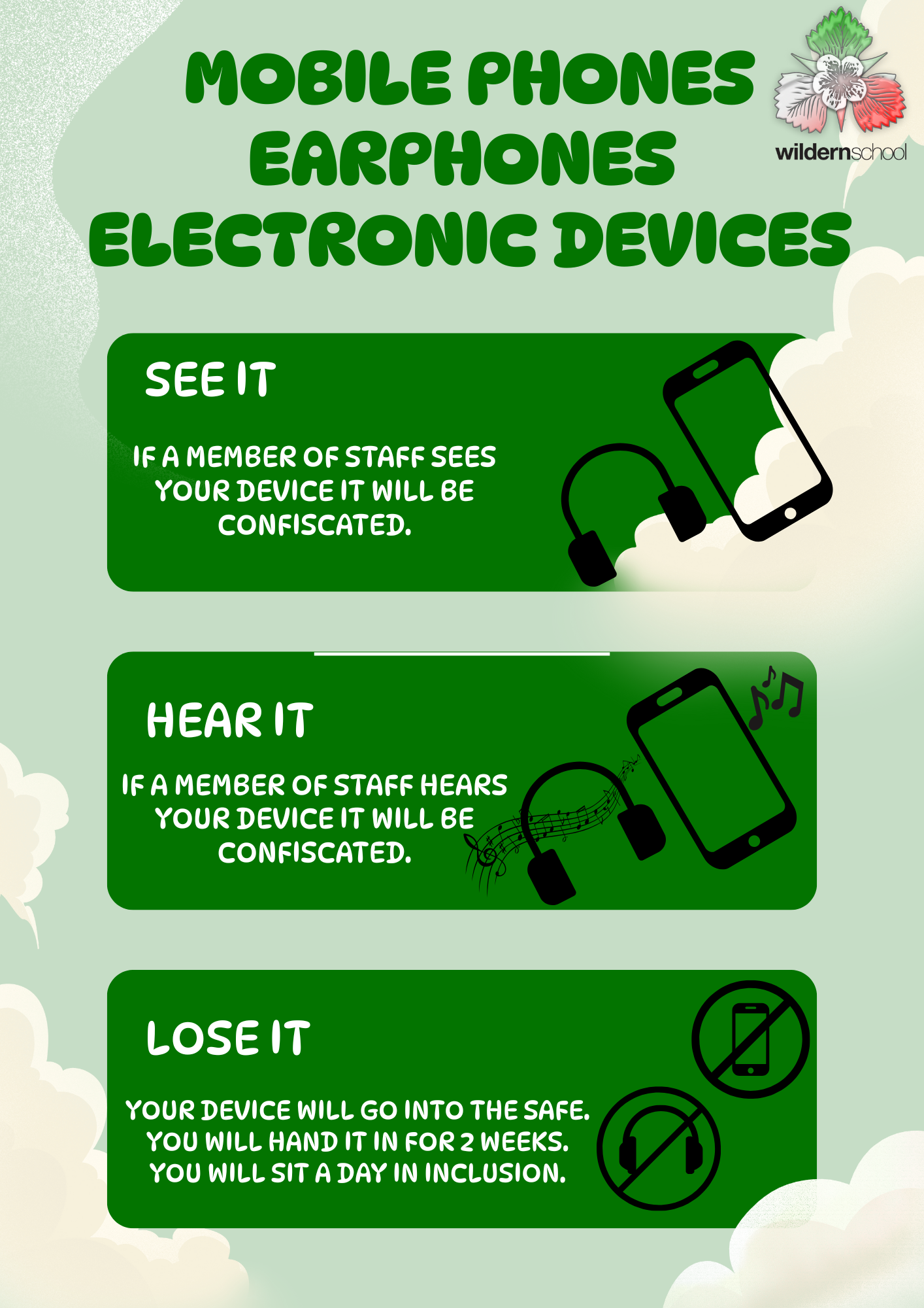 If a student's phone, headphones, or any other electronic device is seen at any time (unless a teacher has explicitly instructed its use in a lesson), it will be confiscated immediately. Devices should be in bags, switched off, and not in pockets, hands, or anywhere else.